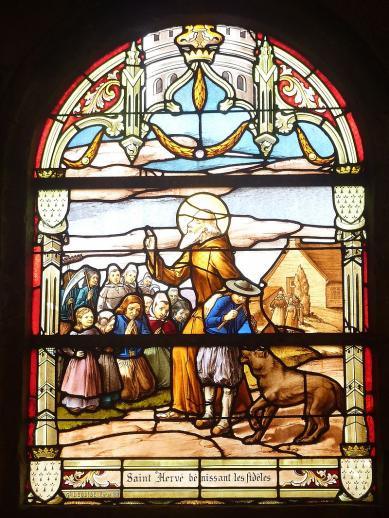 Kerlaz : église paroissiale Saint-Germain, vitrail de Gabriel Léglise représentant "saint Hervé bénissant les fidèles"