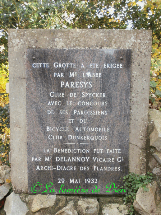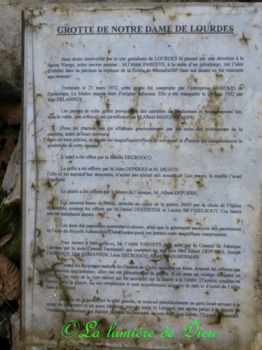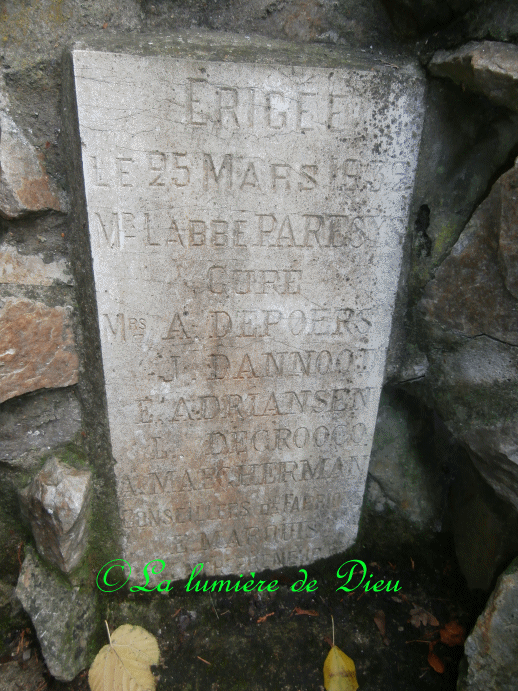Les pierres de cette grotte proviennent des carrières du Boulonnais et nous pouvons lire, sous la voûte, que celle-ci ont été offertes par M.Albert MAEGHERMAN.